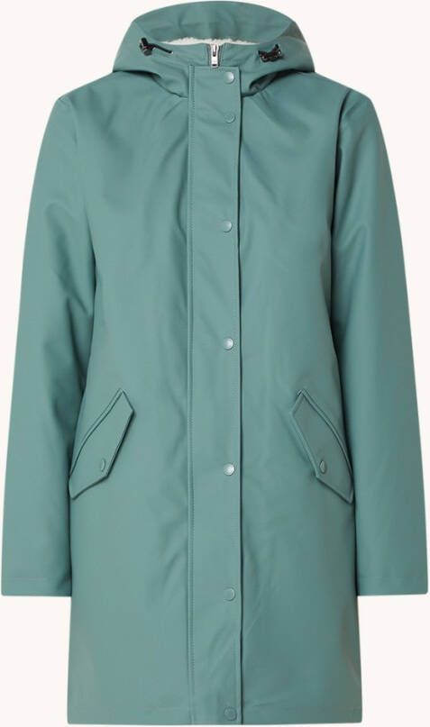 America Today dames regenjas. De Janice teddy is een lange regenjas met capuchon ideaal voor op de fiets. De capuchon kan doormiddel van een trekkoord aangetrokken worden voor extra bescherming. Daarnaast is de regenjas voorzien van een rits- en drukknoopsluiting en twee steekzakken met drukknoopsluiting. De teddy binnenstof houd je lekker warm tijdens de koude regen dagen. Product details: • Straight fit • Vaste capuchon • Teddy binnenkant • Rits- en drukknoopsluiting.