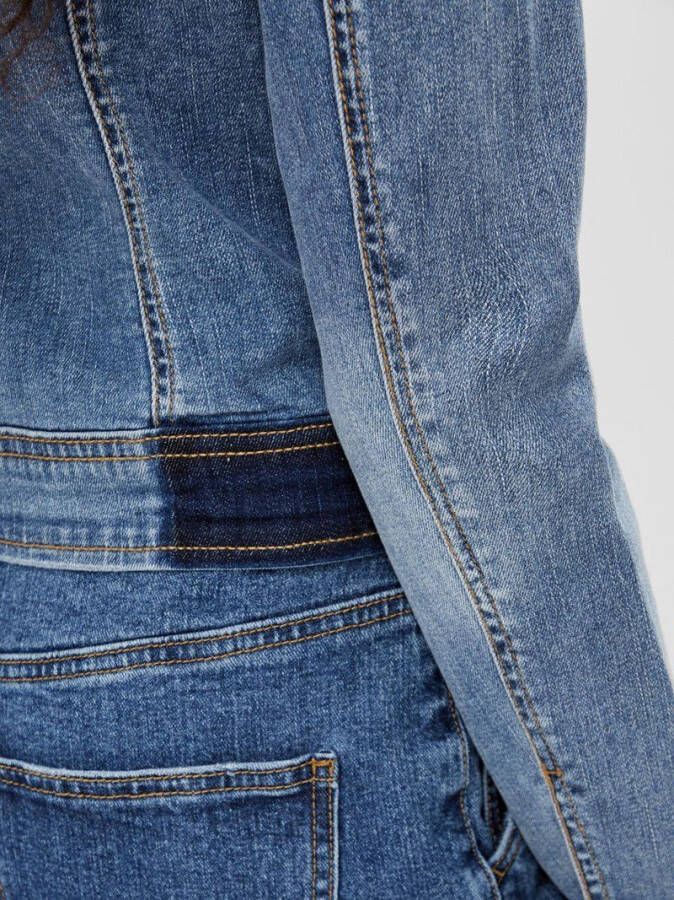 Kenmerken● Blauwe spijkerjas ● Knoopsluiting ● Borstzakjes ● Lengte voorkant 54cm, achterkant: 52cm bij maat M ● Mouwlengte: 61cm Pasvorm ● Deze spijkerjas heeft een aansluitende pasvorm Materiaal ● Samenstelling: 95% Katoen, 3% Polyester en 2% Elastaan Wasvoorschrift ● Machinewas 30 graden● Niet in de droger (hangend laten drogen) ● Strijken op lage temperatuur ● Niet bleken Stijladvies Combineer deze spijkerjas bij je favourite outfit of tijdens de frisse zomerdagen.